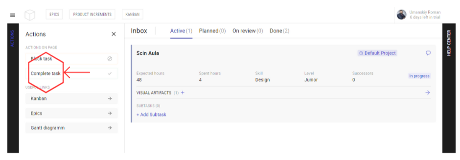 6. Select the task block and click on "Complete task" to move the task to the Review stage.