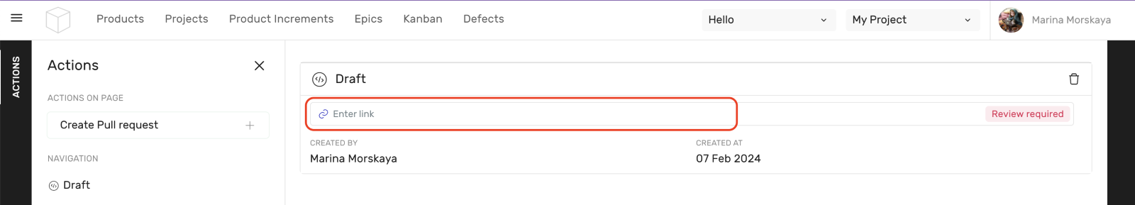 The Executor receives a Task in the Inbox, which they then accept. Active Task contains a field called PULL REQUESTS, where he must add a link to the pull request in order to Complete task.