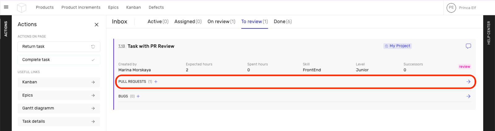 Pull Request Review - a type of verification in the Review stage. It presupposes the presence of pull requests in the task. Depending on the functional role, it provides the user with the ability to: