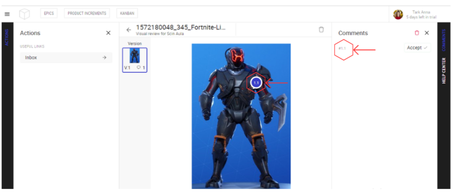 2. Create a comment point on the image. Each comment is a subtask for the executor. The comment number is represented as N.N, where the left side of the point indicates the version number and the right side indicates the comment number within that version (for example, 1.1 - the first version, first comment; 1.2 - the first version, second comment, and so on.