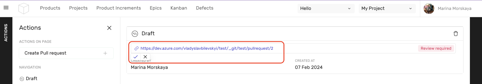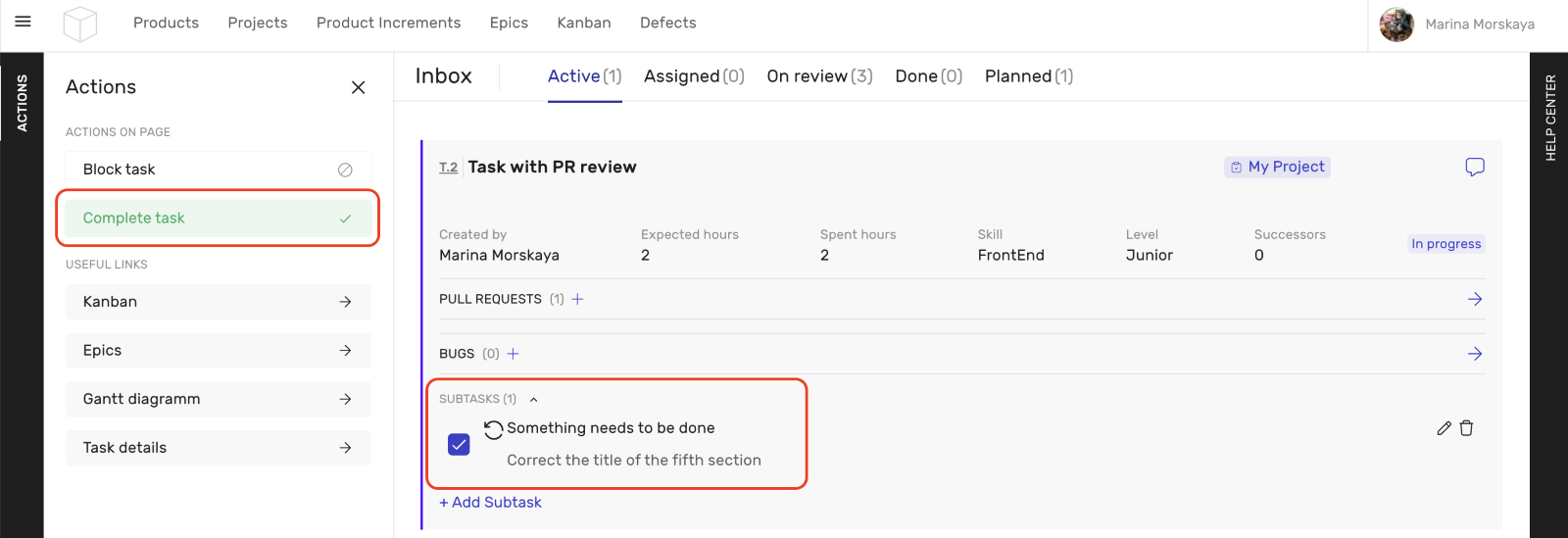The Executor receives a Task in the Inbox, which they then accept. Active Task contains a field called PULL REQUESTS, where he must add a link to the pull request to Complete the task.