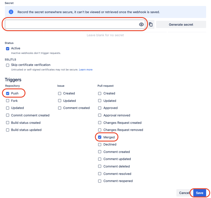Select triggers "Push" and “Merged”.